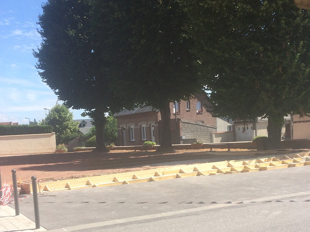 Nous avons avons réaménagé la place, après démontage du muret existant. Nous avons créé un escalier sur la longueur du trottoir, qui a été ensuite fini par des pierres taillées avec un nez de marche et des spots encastrés dans la marche du haut.